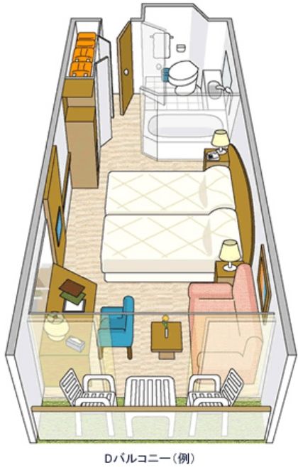 - Kステート及び一部の客室では客船固有の設備(救命ボートや救命いかだ、乗下船用のタラップなど)のため眺望が妨げられます。