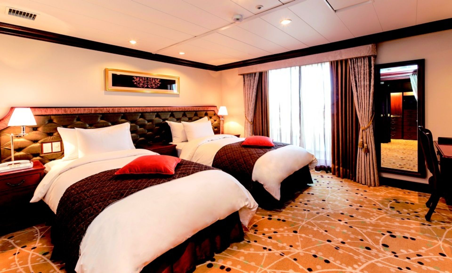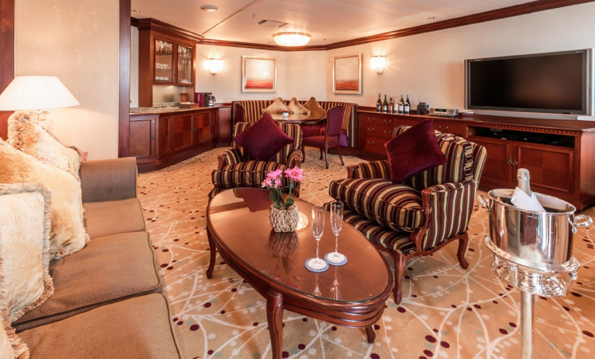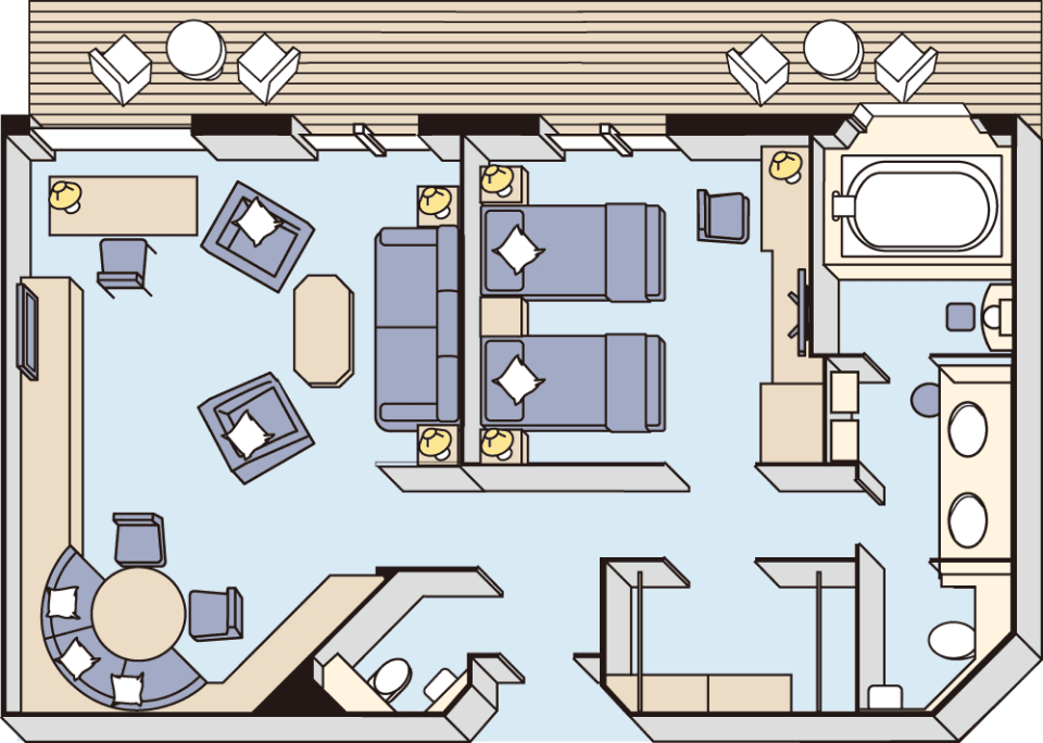 Sロイヤルスイートは、リビング、ベッドルーム、バスルームがそれぞれ独立したお部屋です。リビングルームにはゆっくりとお食事が楽しめるダイニングテーブルがございます。海に面したバスルームでは洋上から朝日を眺めながらのバスタイムをご満喫いただけます。