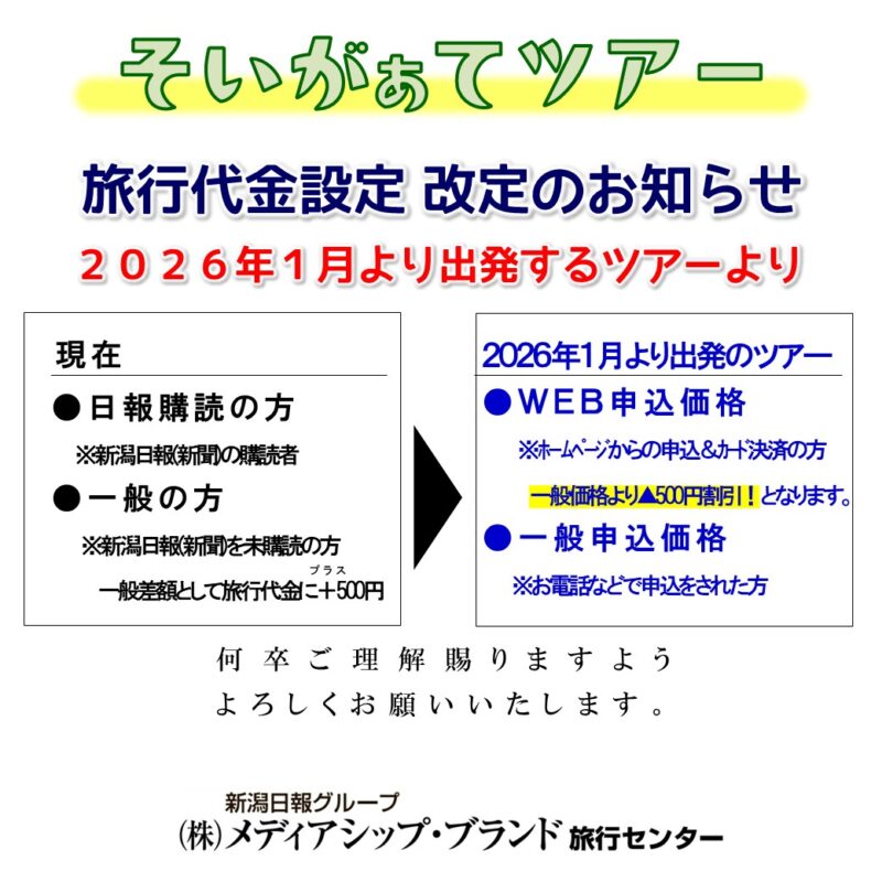 今まで、旅行代金につきましては新潟日報紙の購読者または未購読者によって、価格区分を設定しておりましたが、このたび、2026年1月より、そいがぁてツアーの旅行代金についての設定を改定させていただきます。