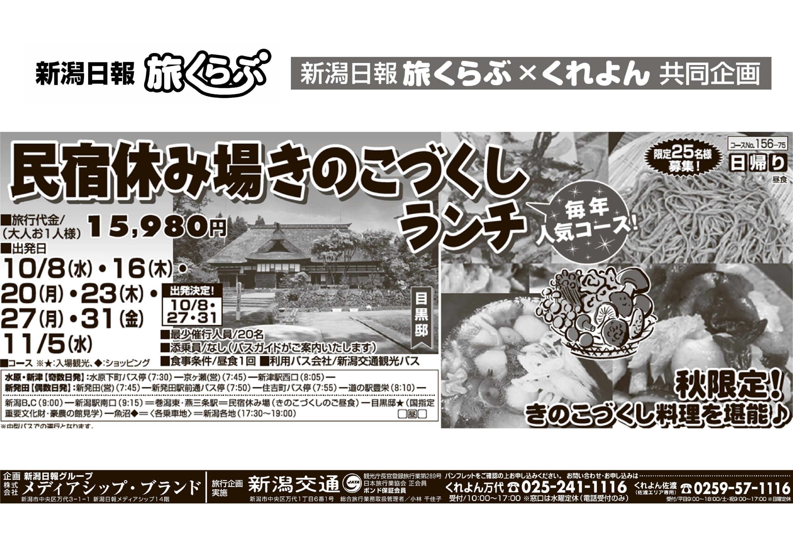 【新潟日報旅くらぶ】 民宿休み場きのこづくしランチ 日帰り