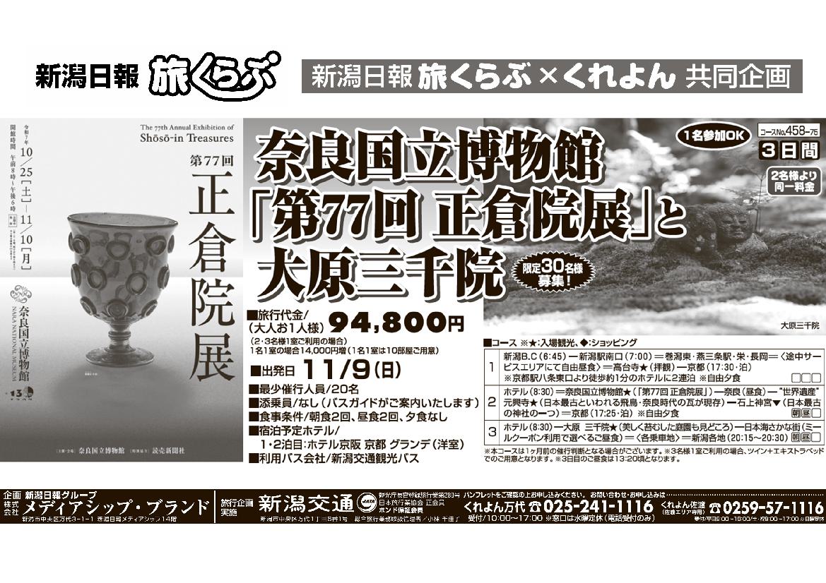 【新潟日報旅くらぶ】 奈良国立博物館「第77回正倉院展」と大原三千院 3日間