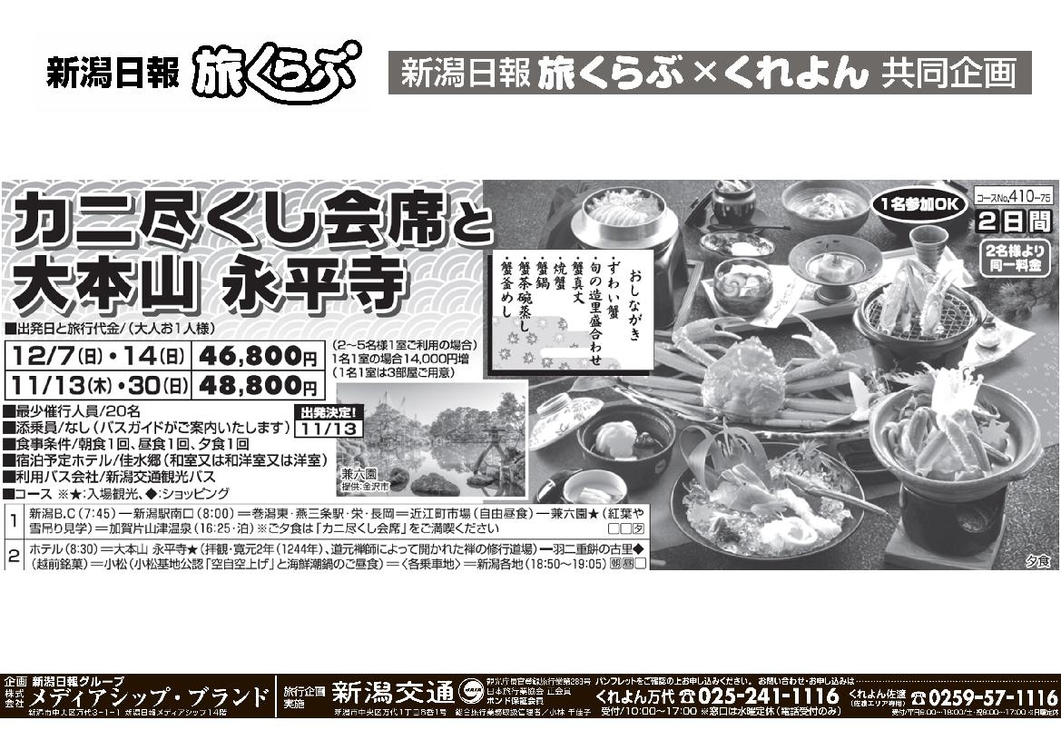 【新潟日報旅くらぶ】 カニ尽くし会席と大本山 永平寺 2日間