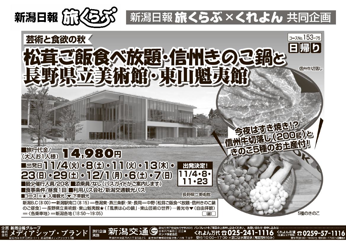 【新潟日報旅くらぶ】 松茸ご飯食べ放題・信州きのこ鍋と長野県立美術館・東山魁夷館 日帰り