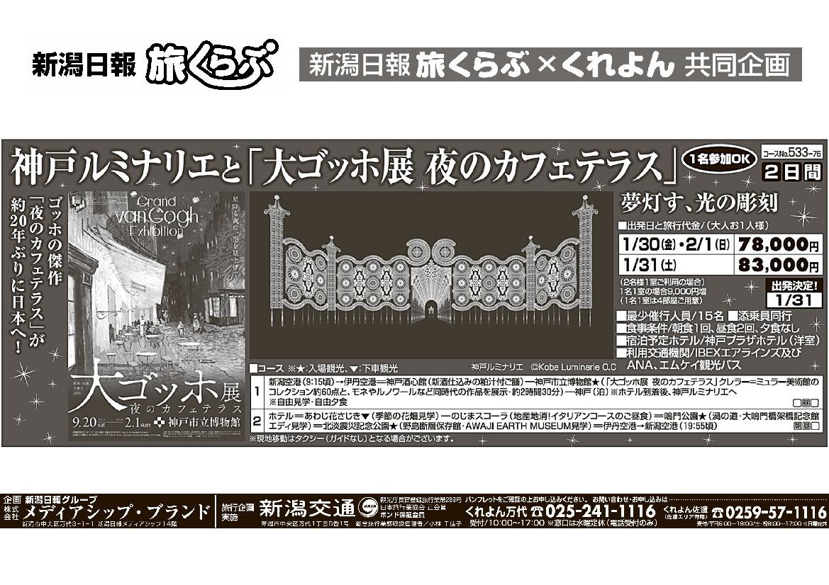 【新潟日報旅くらぶ】 神戸ルミナリエと「大ゴッホ展 夜のカフェテラス」夢灯す、光の彫刻 2日間