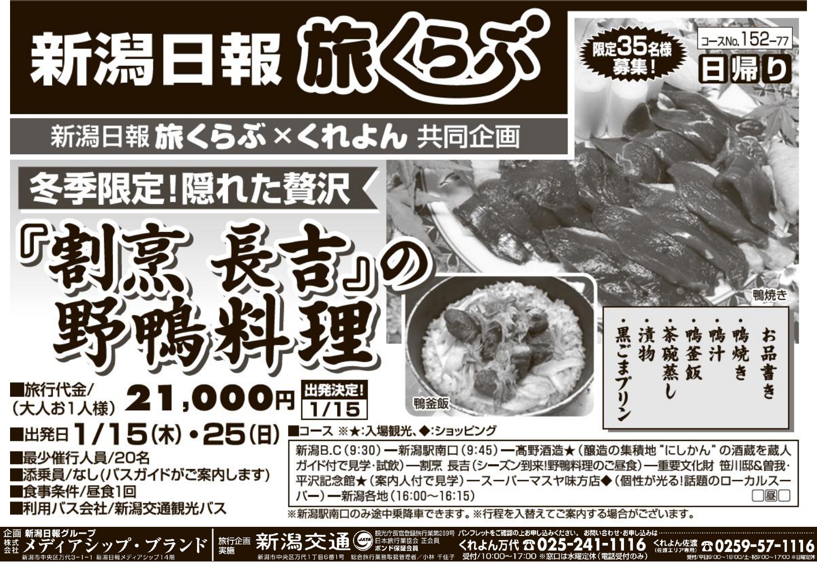 【新潟日報旅くらぶ】 『割烹 長吉』の野鴨料理 日帰り