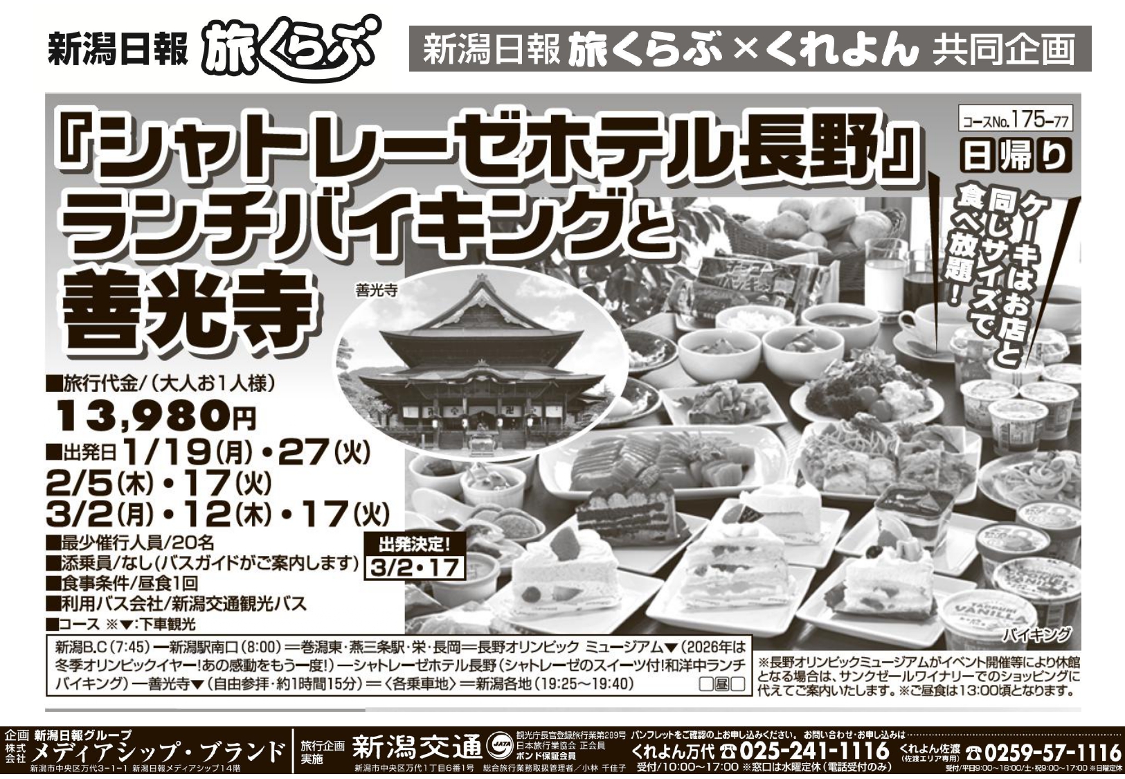【新潟日報旅くらぶ】 『シャトレーゼホテル長野』ランチバイキングと善光寺 日帰り