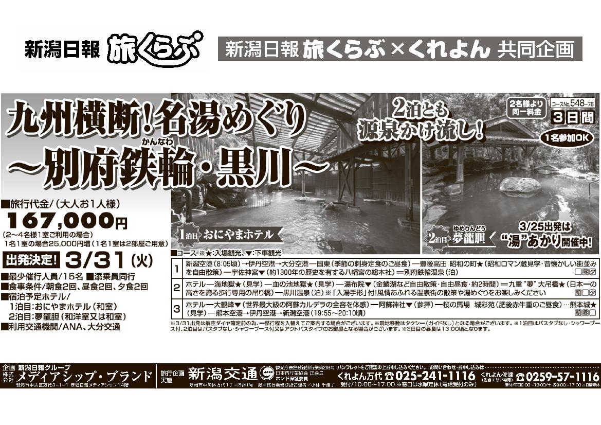 【新潟日報旅くらぶ】 九州横断!名湯めぐり~別府鉄輪・黒川~ 3日間