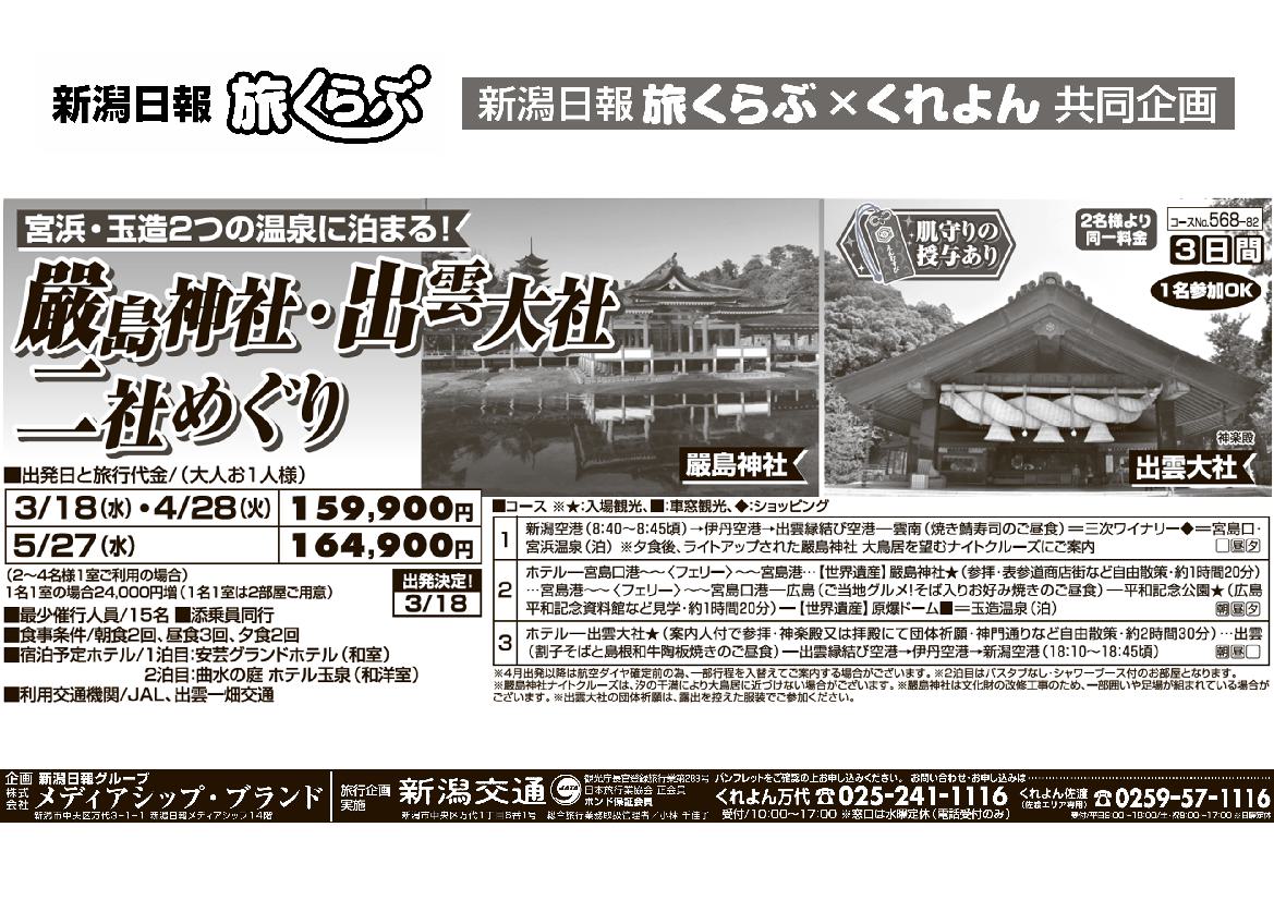 【新潟日報旅くらぶ】 嚴島神社・出雲大社二社めぐり 3日間