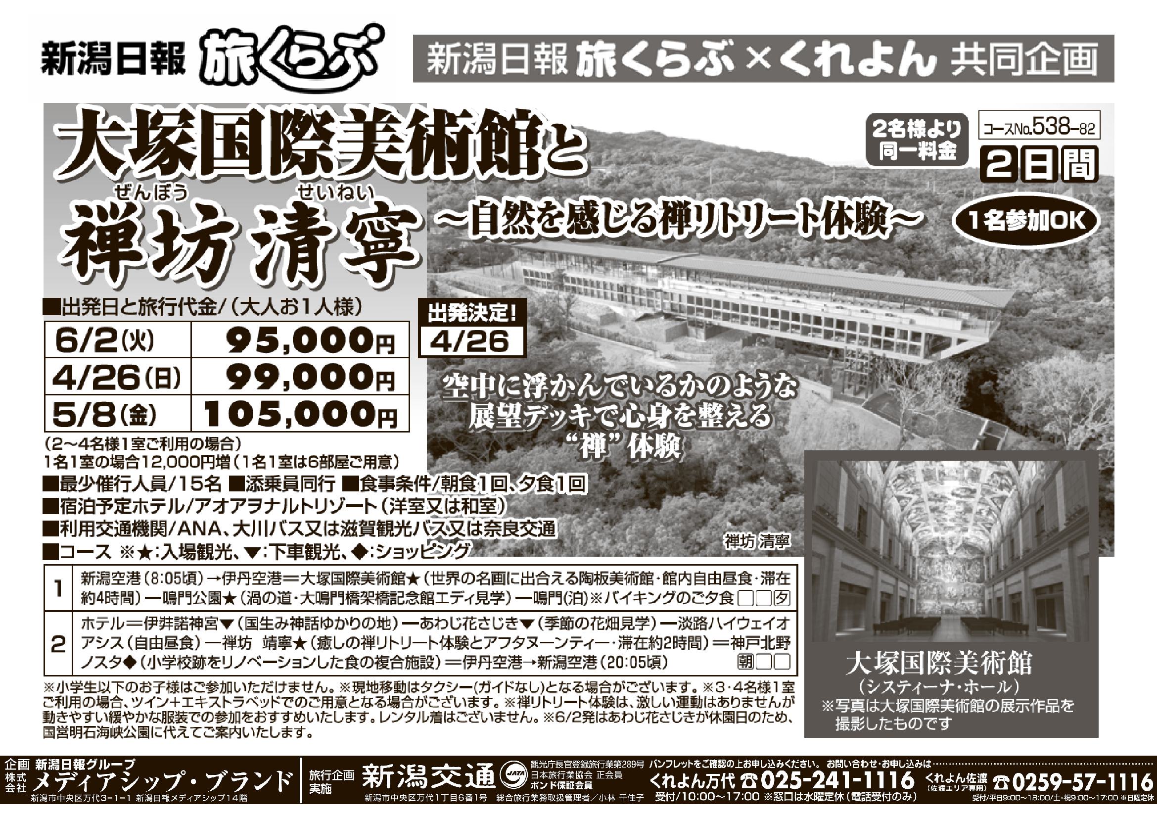 【新潟日報旅くらぶ】 大塚国際美術館と禅坊 清寧 2日間