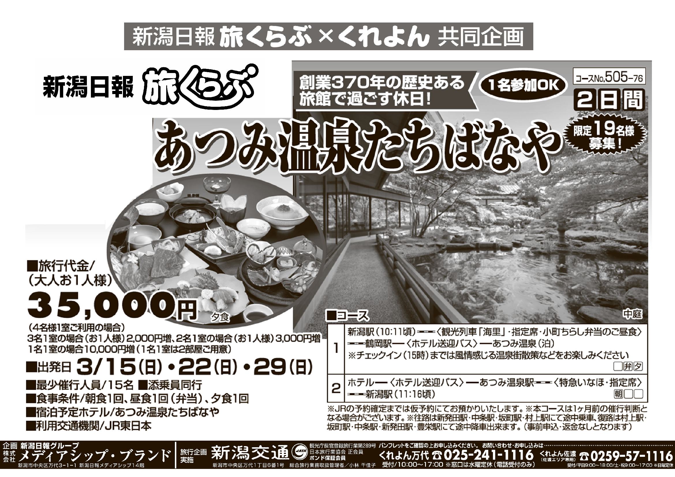 【新潟日報旅くらぶ】 海里で行く!あつみ温泉たちばなや 2日間