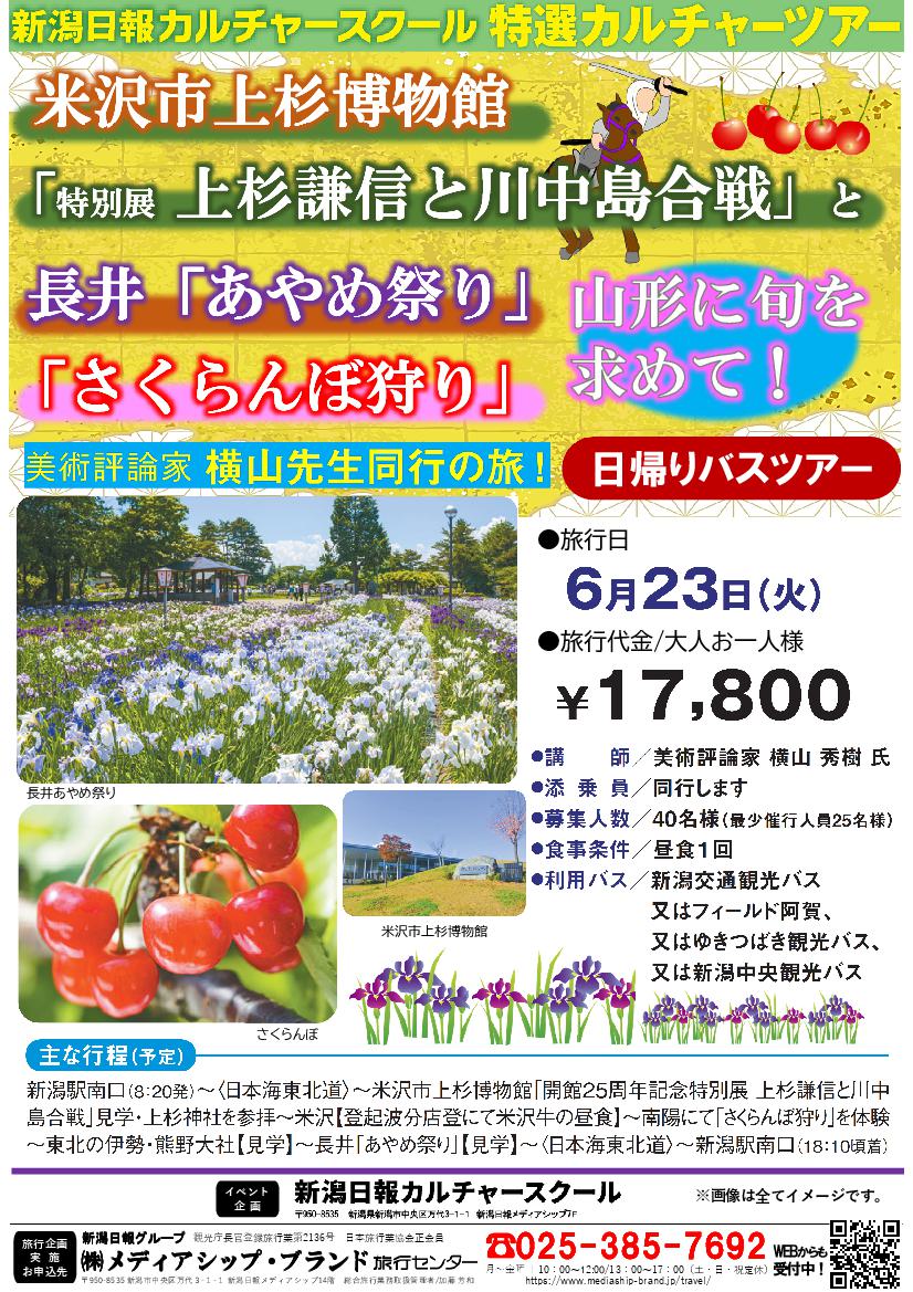 新潟日報カルチャースクール 特選カルチャーツアー 米沢市上杉博物館「特別展 上杉謙信と川中島合戦」と長井「あやめ祭り」、「さくらんぼ狩り」山形に旬を求めて! 日帰り