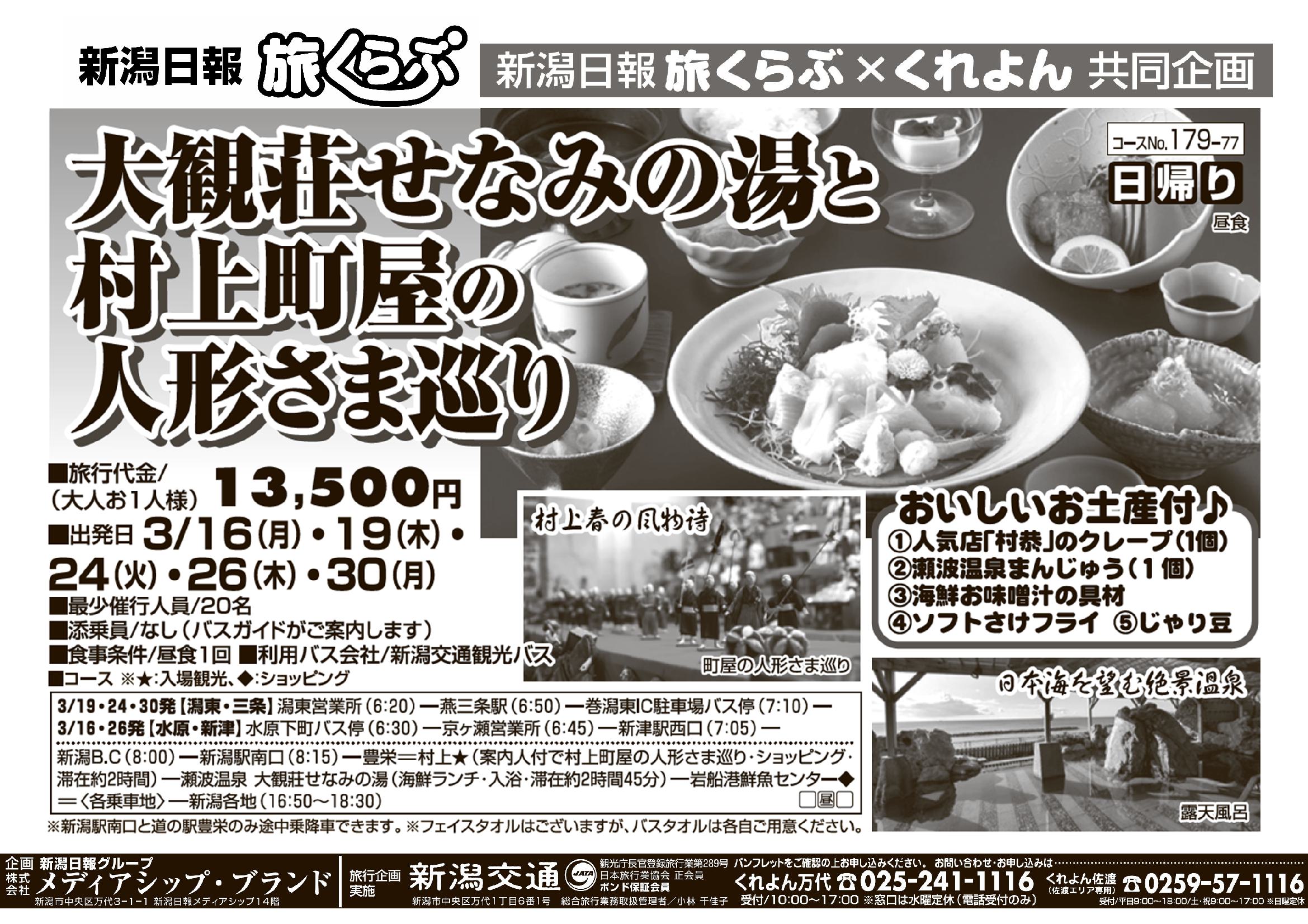 【新潟日報旅くらぶ】 大観荘せなみの湯と村上町屋の人形さま巡り 日帰り