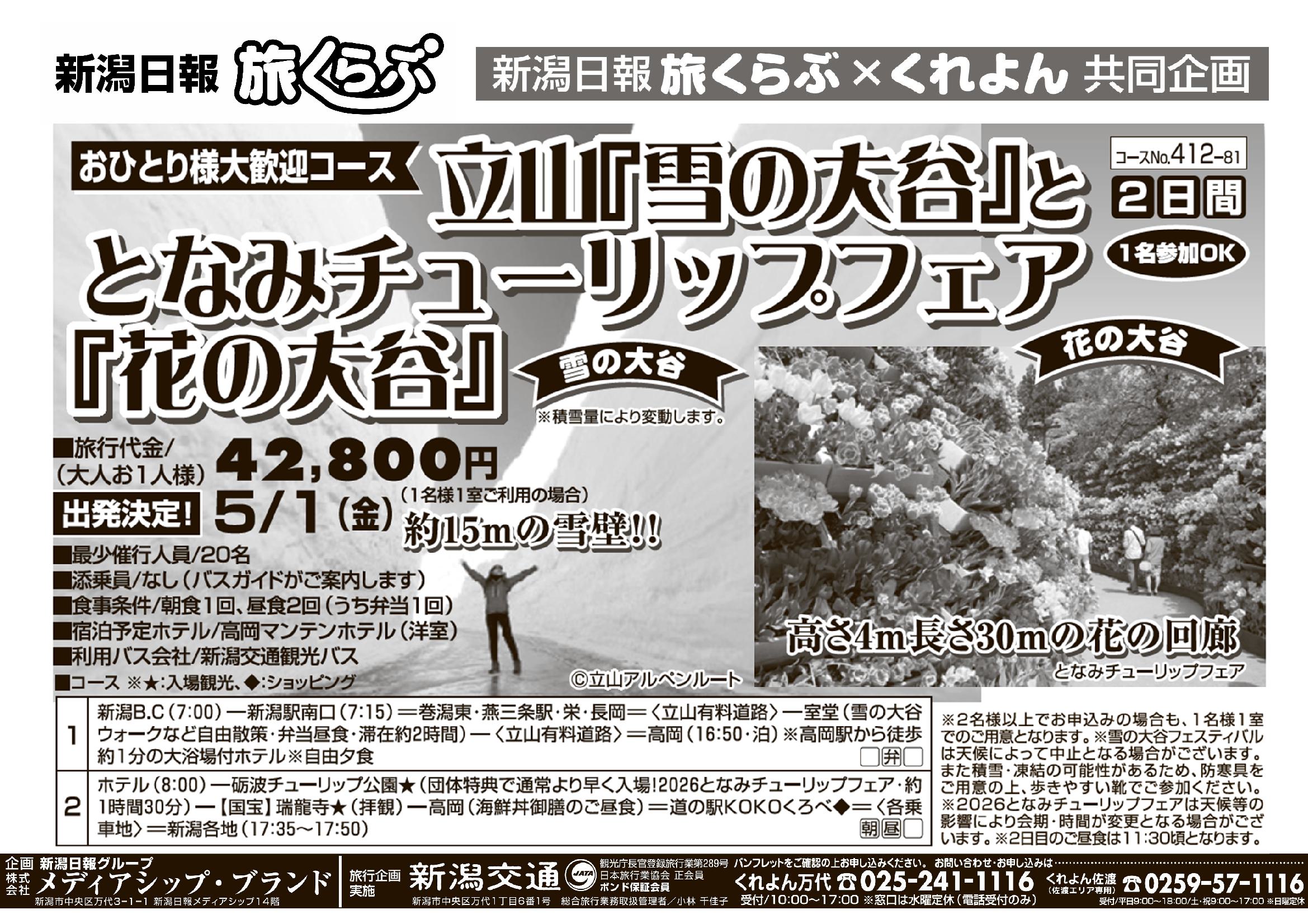 ※このツアーは新潟交通㈱が旅行企画実施をするツアーとなり、受託販売となります。