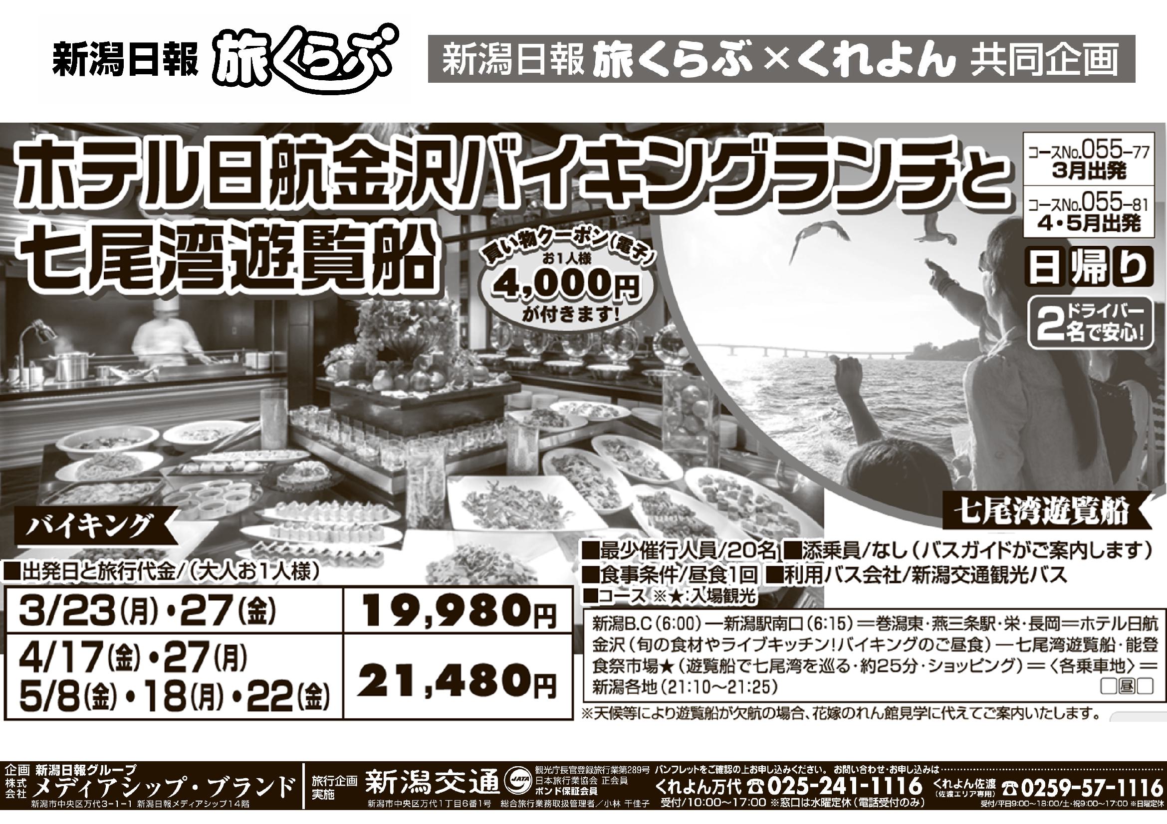 【新潟日報旅くらぶ】 【4・5月出発分】ホテル日航金沢バイキングランチと七尾湾遊覧船 日帰り