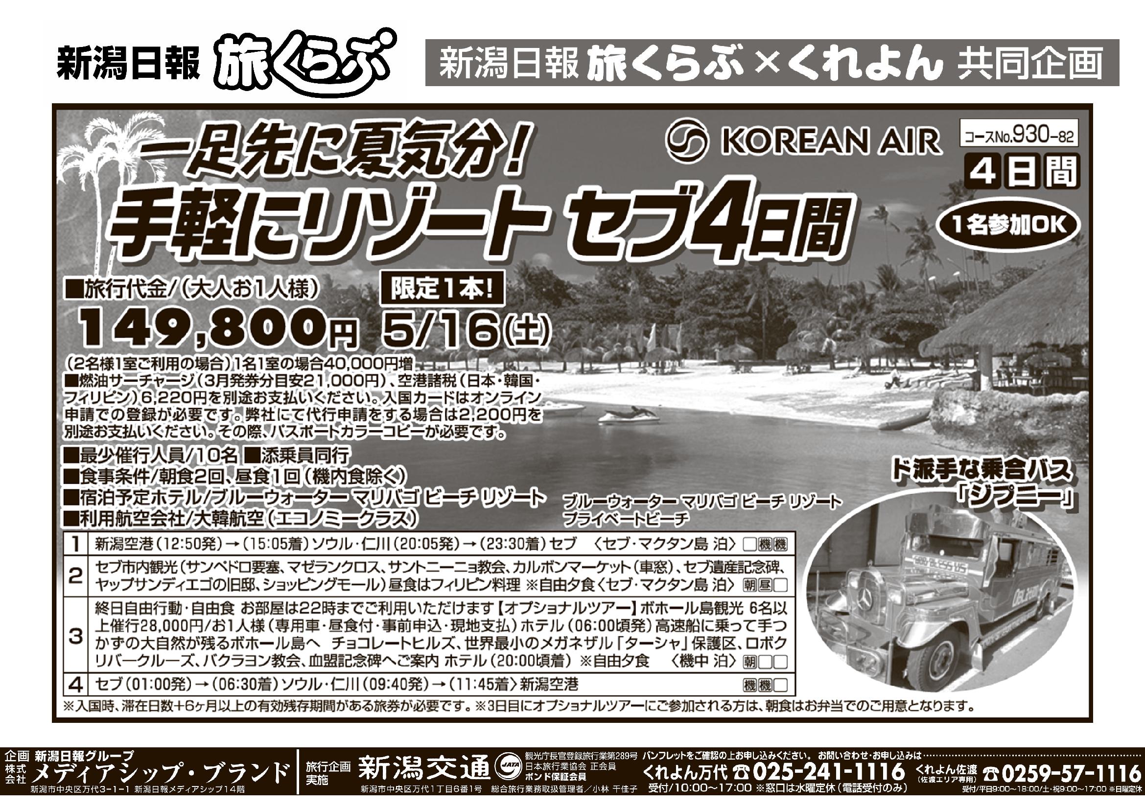 【新潟日報旅くらぶ】 一足先に夏気分!手軽にリゾート セブ4日間