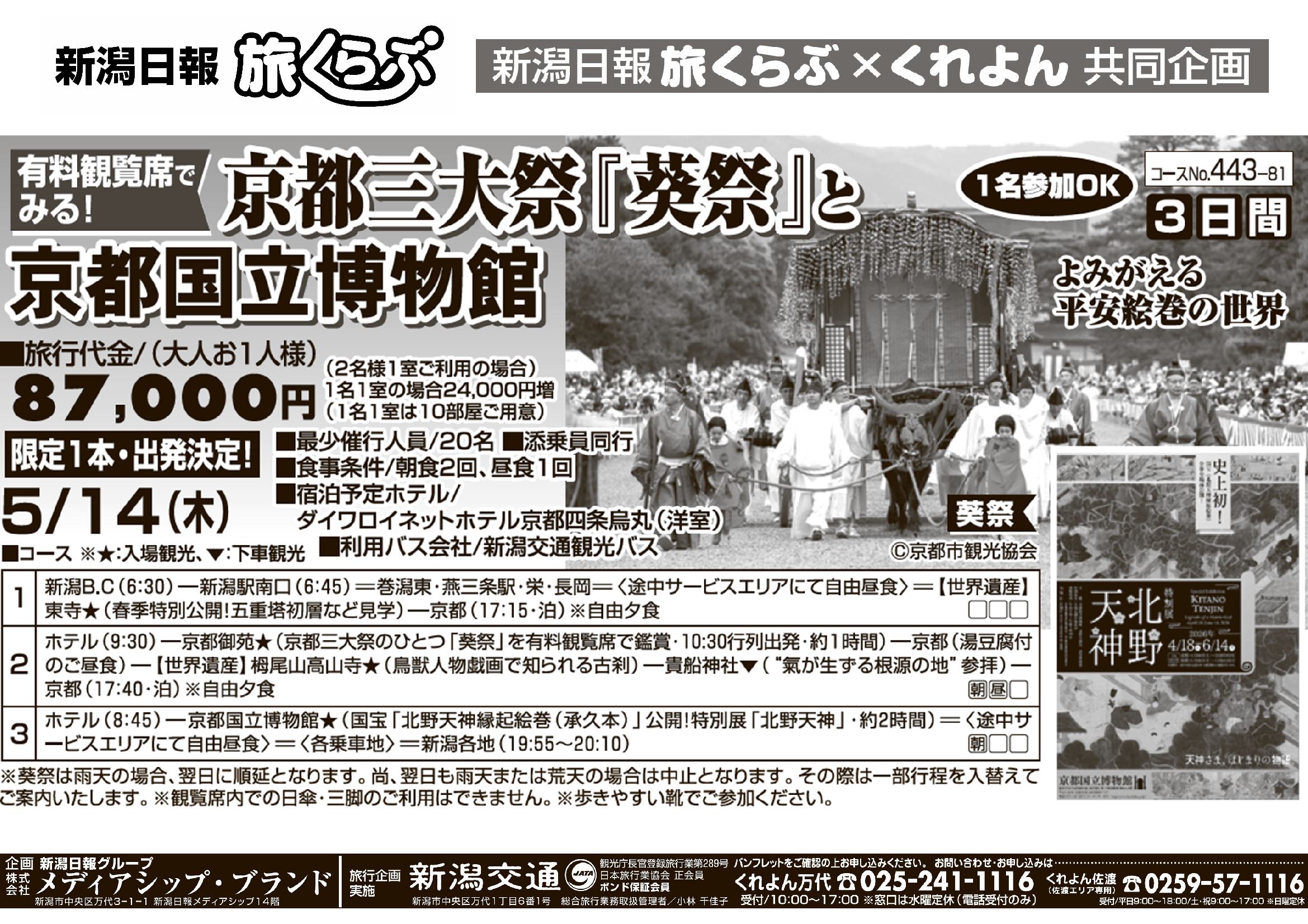 【新潟日報旅くらぶ】 京都三大祭『葵祭』と京都国立博物館 3日間