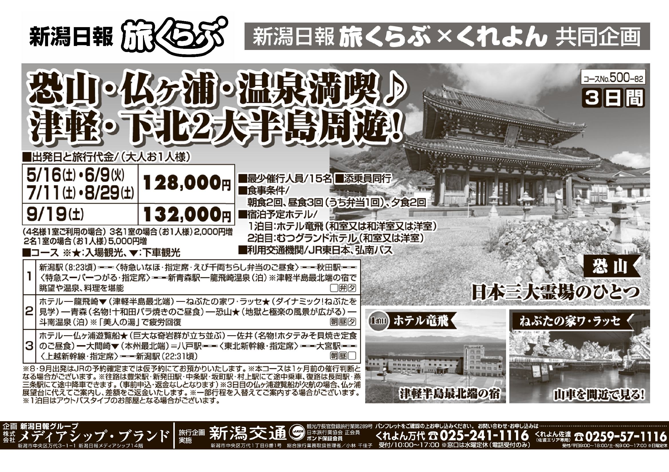 【新潟日報旅くらぶ】 恐山・仏ヶ浦・温泉満喫♪津軽・下北2大半島周遊! 2日間